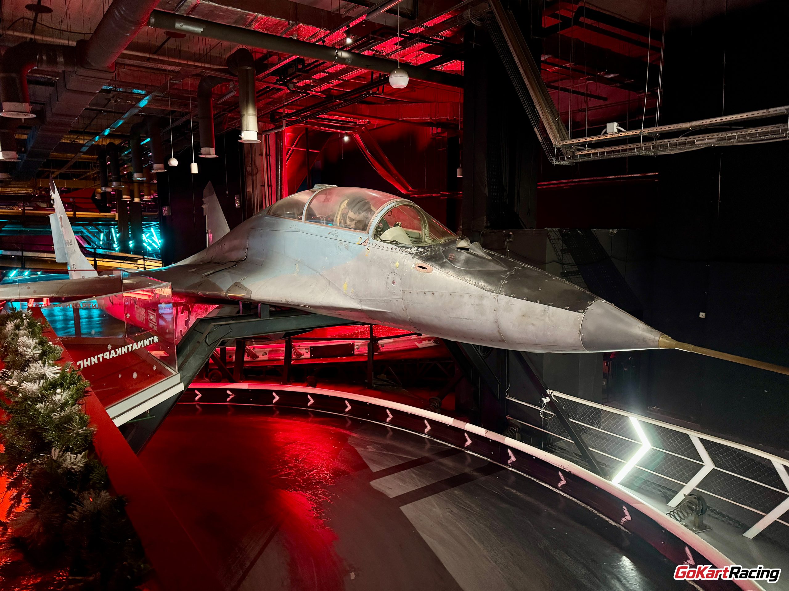 Здесь есть кафе с кальяном и отличным видом на трассу. Вокруг много интересных экспонатов и в некоторые можно зайти внутрь. В центре внимания стоит настоящий боевой самолет прямо посредине трассы и его невозможно не заметить. Картинг находится в торговом центре Европолис поэтому после заезда можно отправиться на шопинг по фудкорту или в другие развлечения